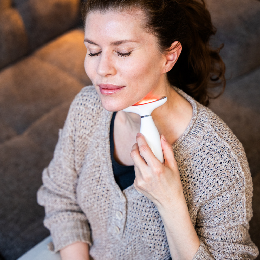 FaceSculpt Pro™ kombinerer varme, rødt LED-lys og blid vibration for at stimulere kollagenproduktionen og blodcirkulationen. Teknologien er inspireret af kliniske behandlinger og designet til hjemmebrug – helt smertefrit.
