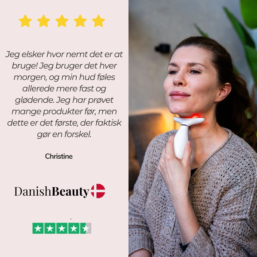 Professionel anti-age behandling hjemme. Drømmer du om fast, strålende hud uden dyre klinikbesøg? FaceSculpt Pro™ fra DanishBeauty giver dig spa-resultater derhjemme. Dette innovative anti-aging apparat kombinerer tre gennemtestede teknologier – varme, vibration og LED-lys – i én enhed, så du kan nyde kraftfulde, videnskabsbaserede behandlinger præcis når det passer dig. Slip for at bestille tider på klinikken og spilde tid i venteværelset. Med FaceSculpt Pro™ får du professionelle resultater i ro og mag hjemme.